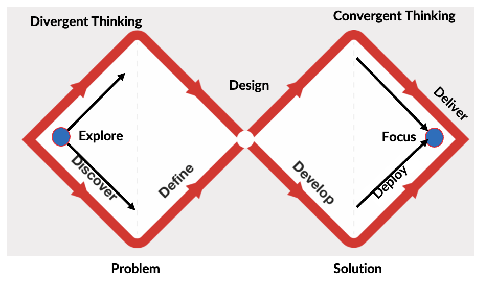 This process clearly conveys a design process to designers and non-designers alike. The two diamonds in the Double Diamond represent a process of exploring an issue more widely or deeply (divergent thinking) and then taking focused action (convergent thinking)